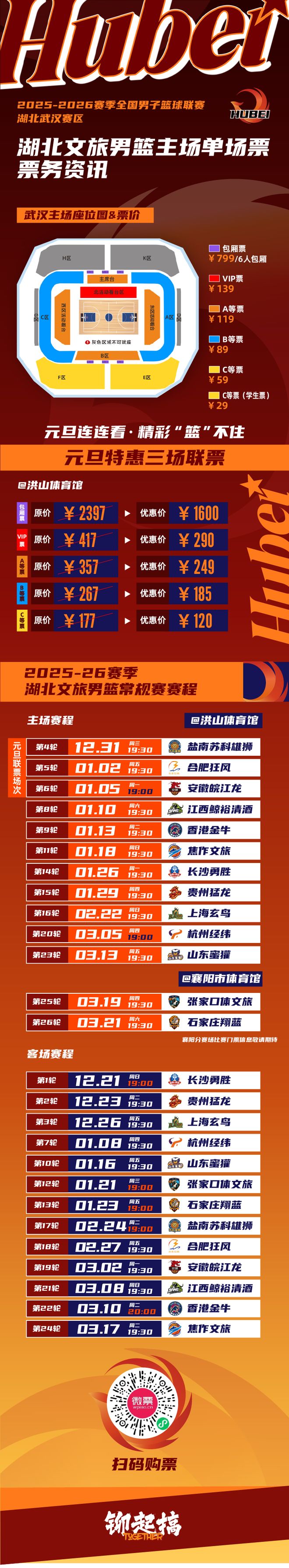 新赛季NBL联赛常规赛将恢复传统的主客场双循环模式,前8名进军季后赛。揭幕战将于12月20日在贵州遵义开战,湖北文旅则是3个连续客场开局,21日客场挑战长沙勇胜,23日和26日客场挑战新军贵州猛龙和上海玄鸟。属于湖北文旅新赛季的主场首秀,则要等到2025年的最后一天,12月31日,他们将在洪山体育馆迎战江苏盐南。